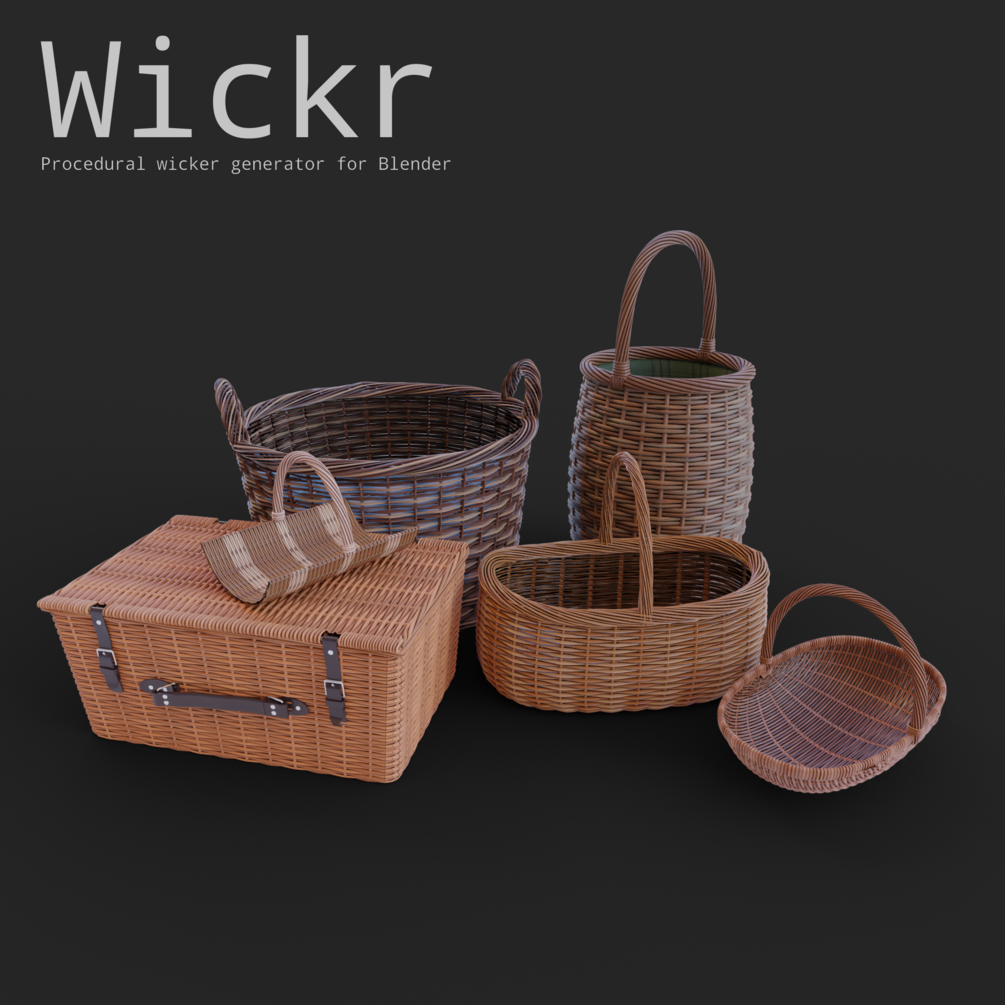 Wickr is a totally procedural wicker texture for Blender. It manipulates the UV coordinates through a handful of procedures to generate displacement maps, diffuse maps, roughness and alpha maps, resulting in a completely customisable wicker material for all your wicker needs. I'm sure there are a whole bunch of non-wicker applications of this material or variations of, so please change it to fit your practice and feel free to re-release!